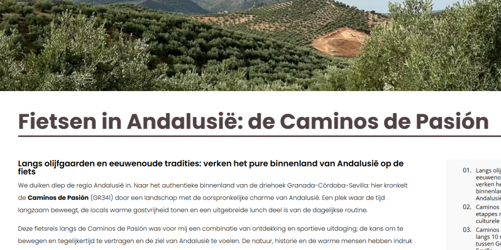 leer másEl periodista Hanno Weima ha publicado tres artículos sobre Caminos de Pasión en la revista digital Grijsopreis.nl: Primero. Informativo y general sobre la ruta. Ver aquí Segundo. Lugares de interés en Caminos de Pasión. Ver aquí Tercero. Lo más destacado en Caminos de Pasión. Ver aquí